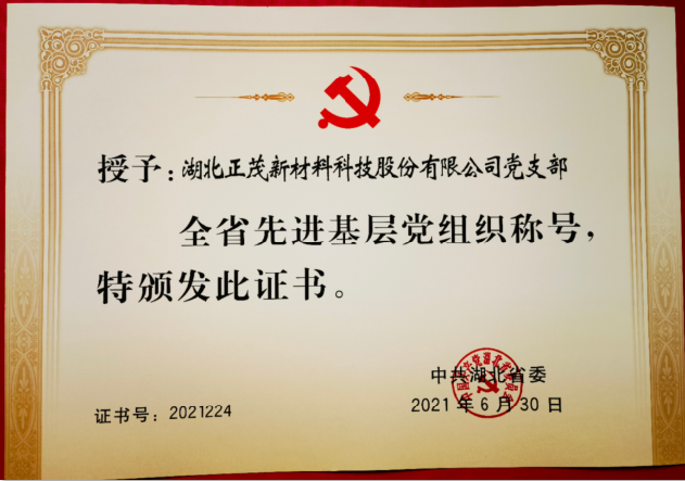 2021年6月30日上午,全省“兩優(yōu)一先”表彰大會(huì)在武漢舉行,湖北正茂新材料科技股份有限公司黨支部獲評(píng)“全省先進(jìn)基層黨組織”榮譽(yù)稱號(hào)!