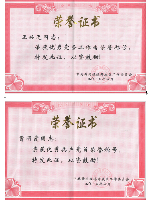 我司饒敏、李媛、管禹三位同志光榮地加入了黨組織,徐小建同志由預(yù)備黨員轉(zhuǎn)為正式黨員。我司黨支部被開發(fā)區(qū)黨工委授予“先進(jìn)基層黨組織”(詳見黃開發(fā)[2015]19號(hào)文件),童國(guó)友、曹麗霞二同志被授予“優(yōu)秀共產(chǎn)黨員”,王興無同志被授予“優(yōu)秀黨務(wù)工作者”。
