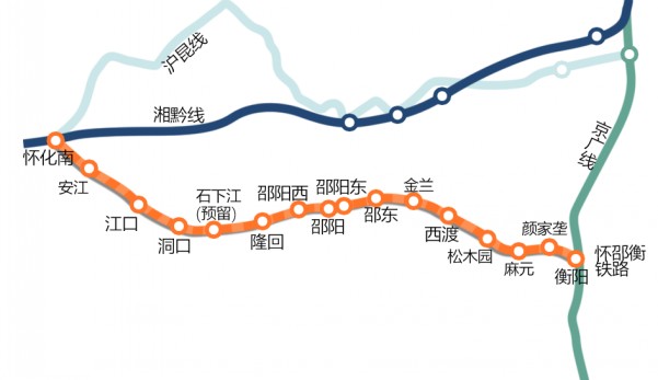 懷邵衡鐵路起于大湘西交通樞紐懷化,經(jīng)湘西南商業(yè)重鎮(zhèn)邵陽,止于中南重鎮(zhèn)衡陽,正線全長318公里。連接京廣高鐵和滬昆高鐵,連接我國西北、西南地區(qū)至東南沿海和珠三角地區(qū)。
