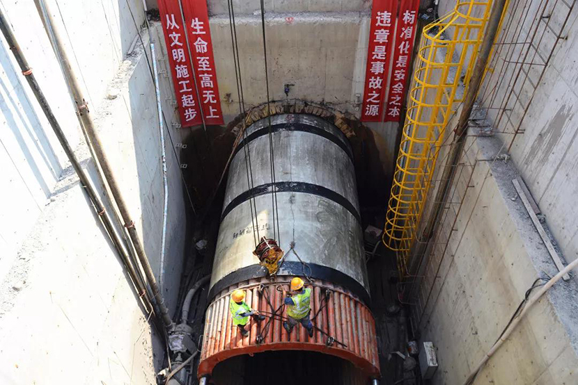 工人正在頂管豎井內(nèi)吊裝管件