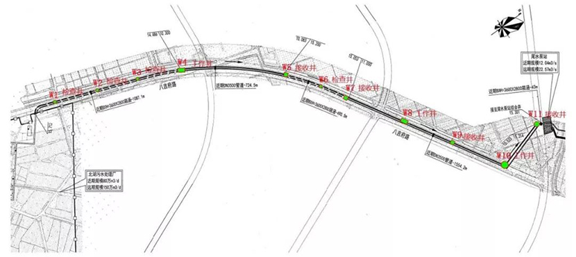 尾水管涵建設(shè)范圍南起于北湖污水處理廠,沿八吉府大道北側(cè)機動車道,止于武惠堤內(nèi)尾水泵站,承擔北湖污水處理后尾水輸送至尾水泵站排入長江。