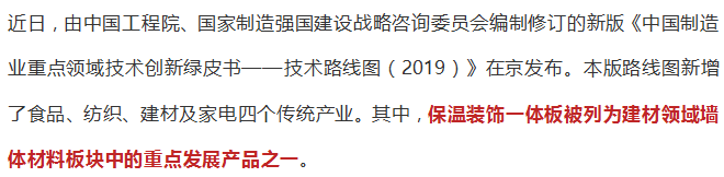 原文:保溫裝飾一體板被列為“中國制造業(yè)重點領域技術(shù)路線圖”重點發(fā)展產(chǎn)品